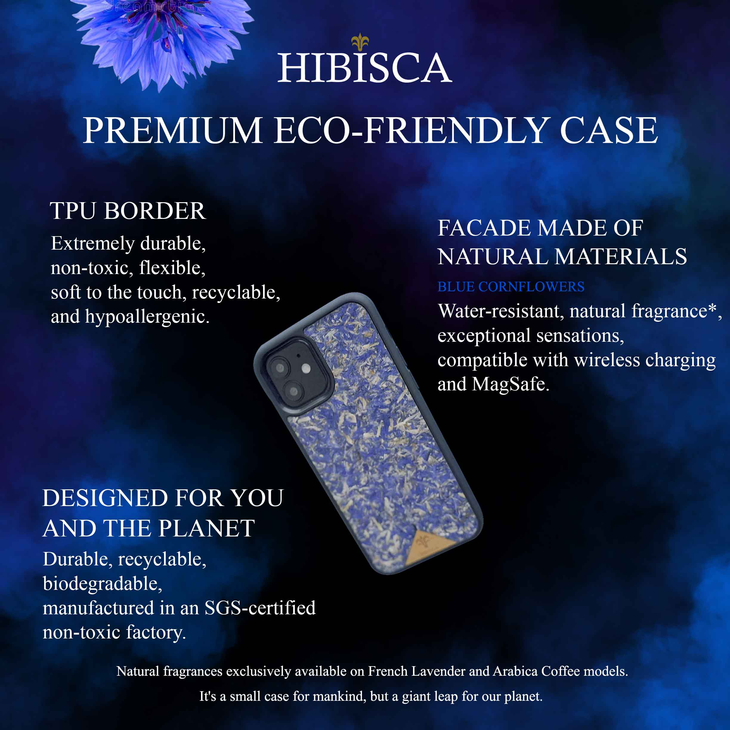 The natural material front panels of Hibisca phone cases offer exceptional touch and an incomparable natural fragrance. They are crafted from carefully selected raw materials, such as French lavender, Arabica coffee, cornflower petals, and even a Swarovski Crystal version made of multiple flowers. The durable texture of each front panel will bring a touch of elegance and sophistication to your decor and style. Moreover, you can rest assured knowing that the materials used to make these cases are sustainable and environmentally friendly.
